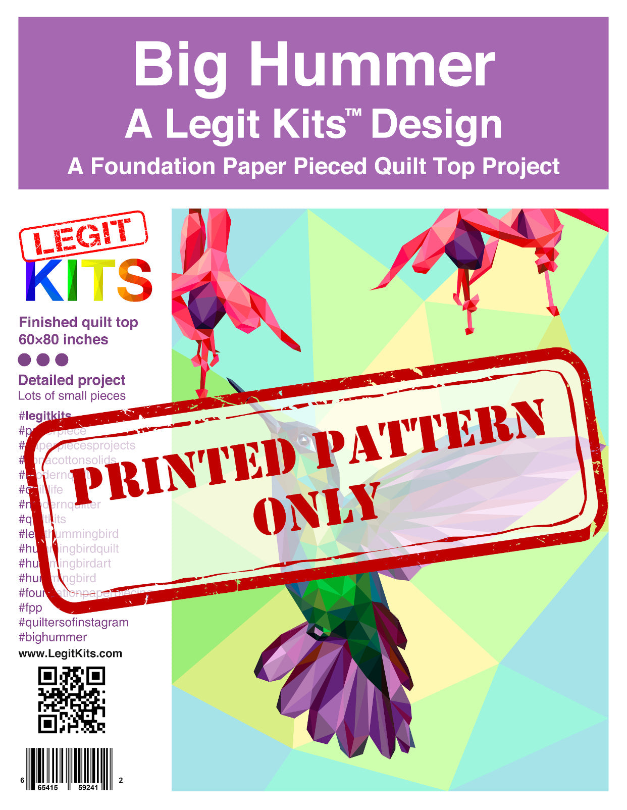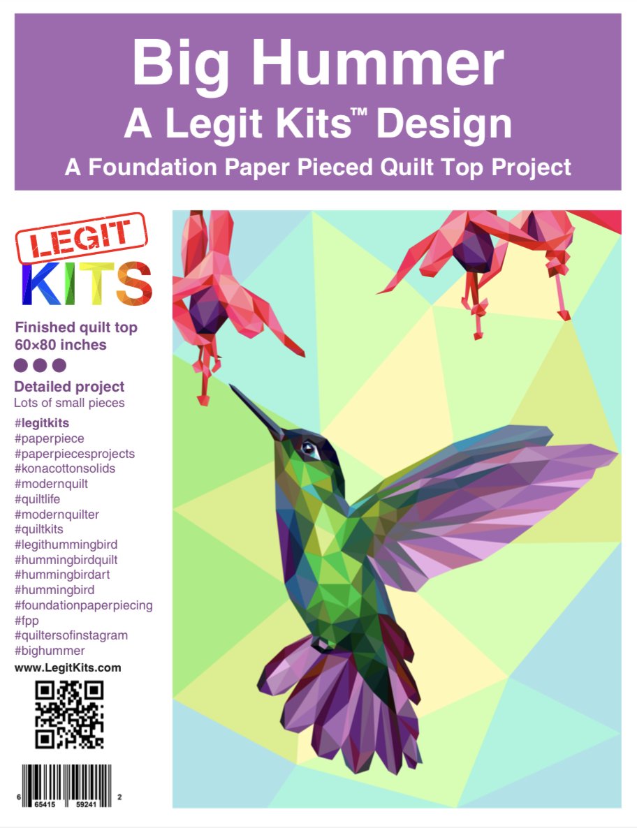 A hummingbird hovers under a clutch of fuchsia flowers. BIG HUMMER is a premium design with everything a foundation paper piece quilter could want. This fully printed pattern pack contains color maps, fabric lists, an assembly guide, and the full pattern. The stunning finished quilt top measures 60 inches wide by 80 inches long.