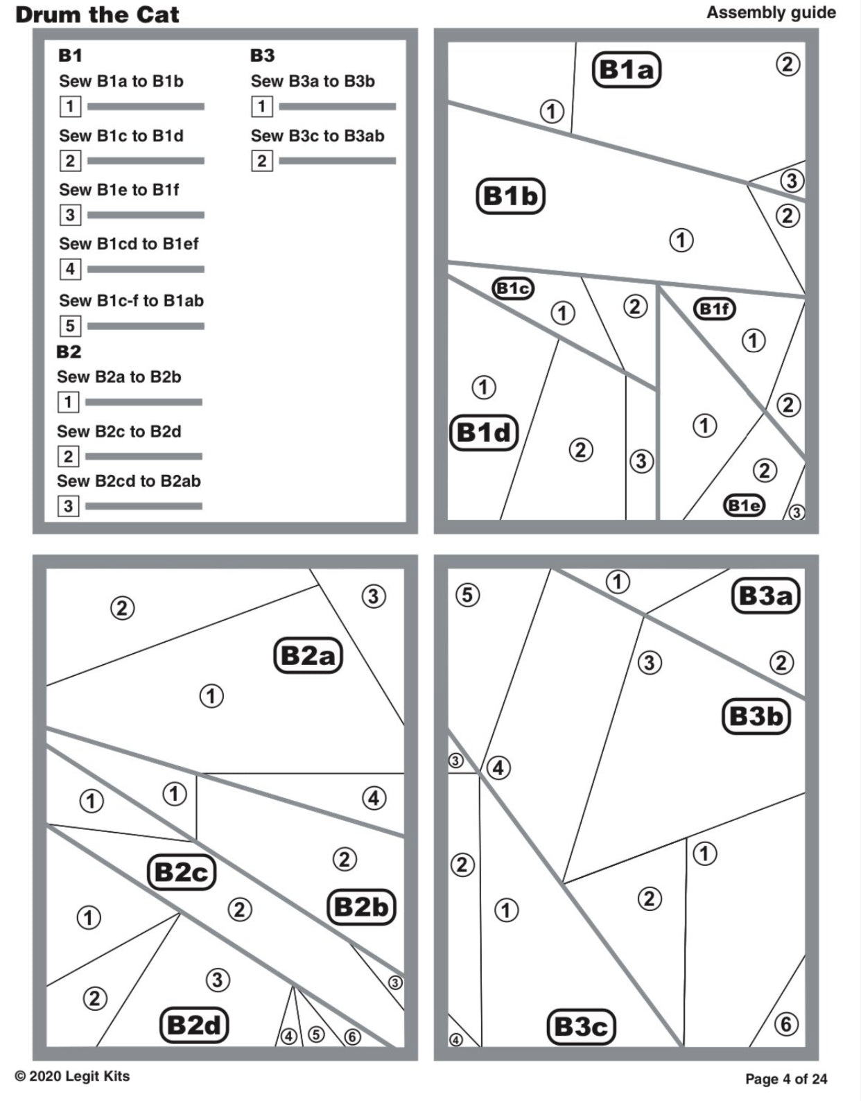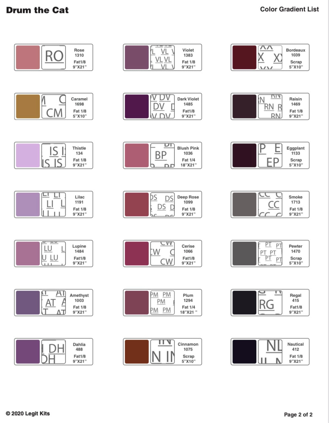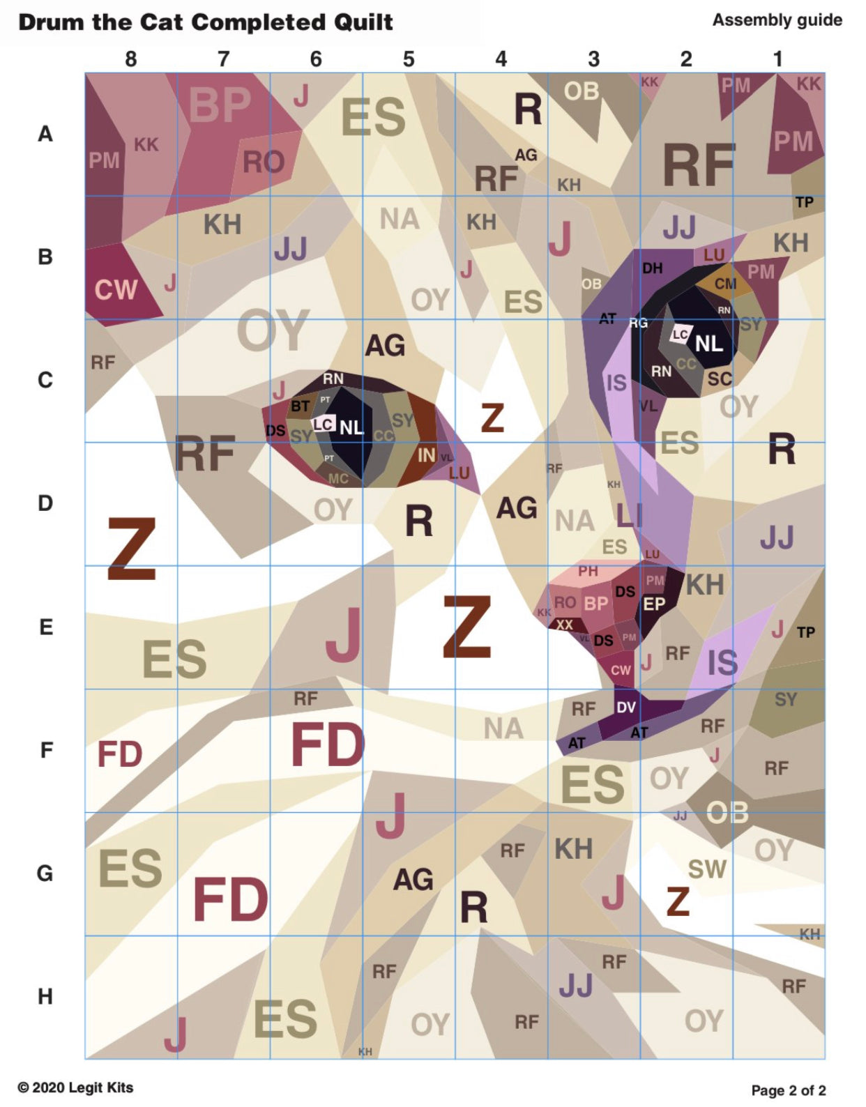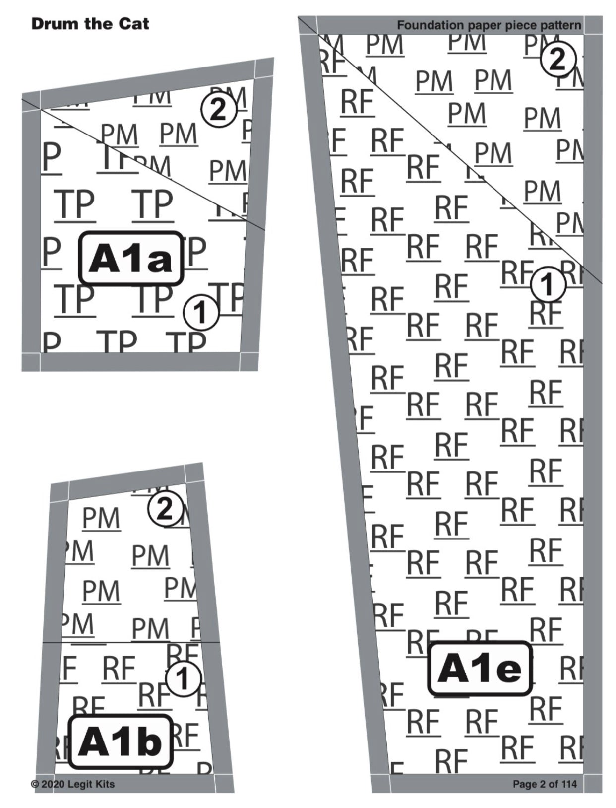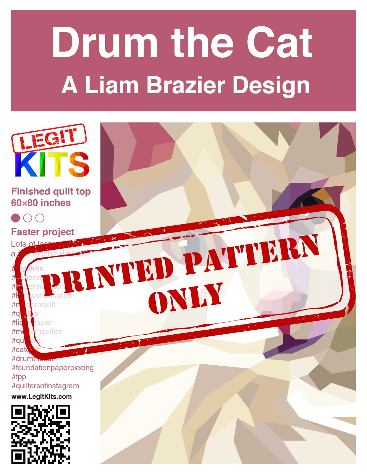 Drum the Cat is a premium design by the globally famous artist, Liam Brazier. This Legit Kits product comes with everything a foundation paper piece quilter could want. This printed pattern only contains color maps, fabric lists, an assembly guide, and the full pattern printed on foundation paper to help you complete this full sized, 60 inch wide by 80 inch tall quilt top.