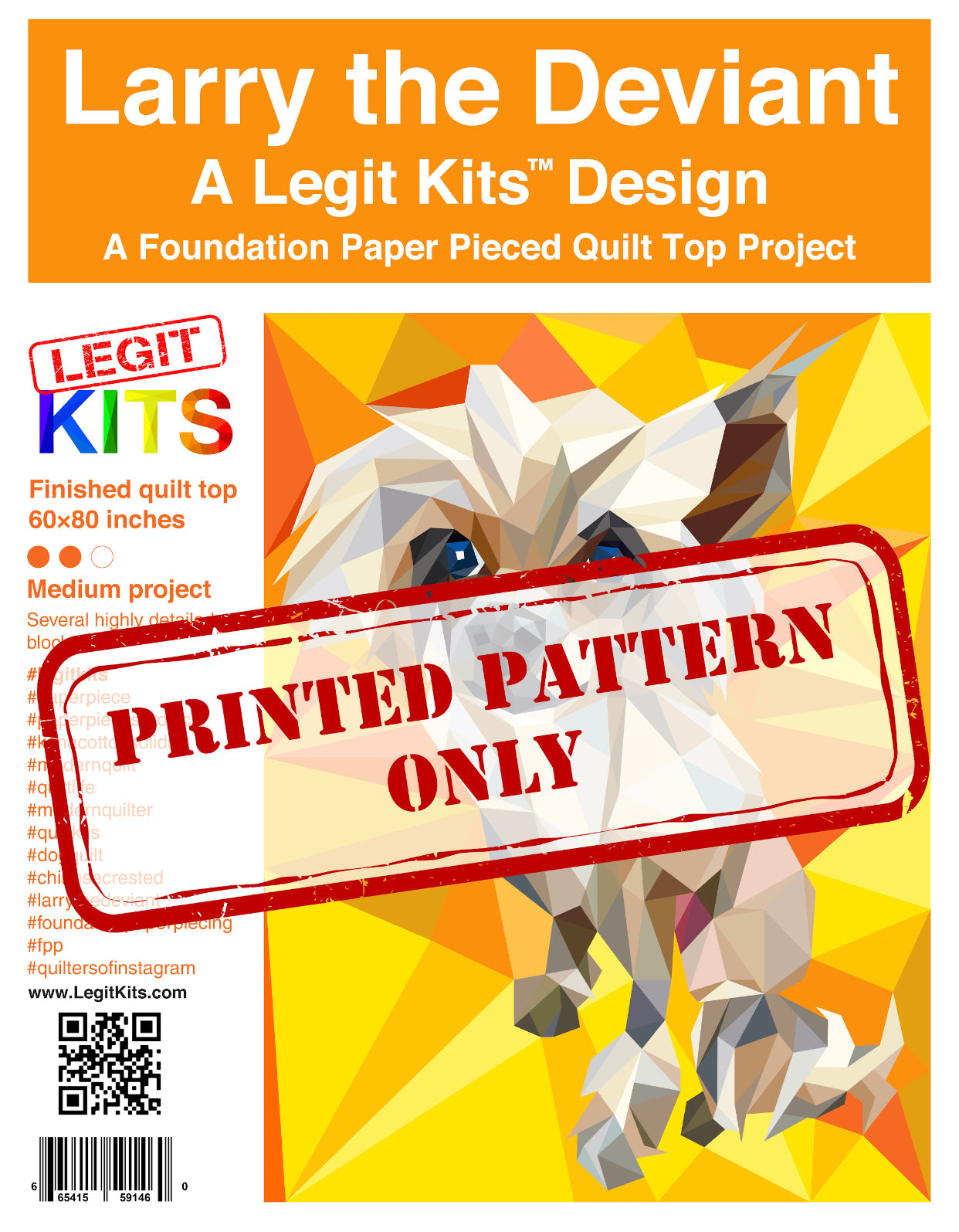 A quirky Chinese Crested poses on a festive yellow background. Larry the Deviant is a premium design with everything a foundation paper piece quilter could want. Our pattern contains color maps, fabric lists, an assembly guide, and the full pattern printed on foundation paper. The quilt top finishes to 60 inch wide by 80 inch tall quilt top.