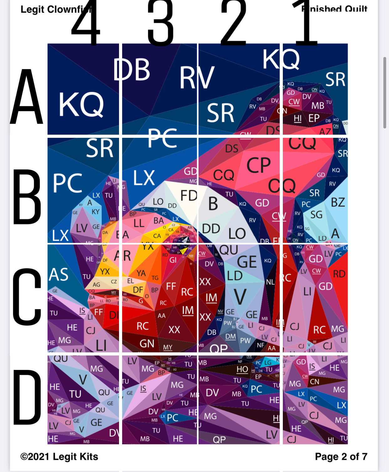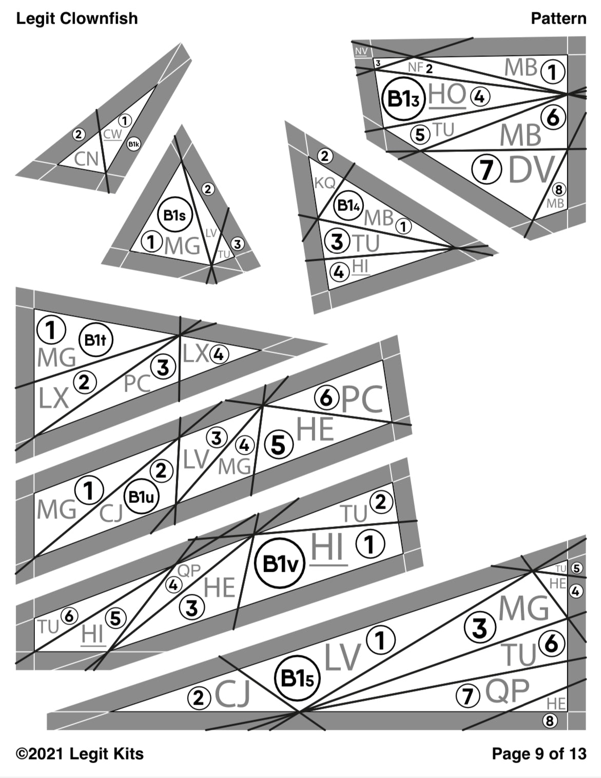 "Is it safe to come out?" Take the plunge with Legit Clownfish, a premium design with everything a foundation paper piece quilter wants. This kit contains color maps, fabric lists, an assembly guide, the full pattern printed on foundation paper, and 76 different shades of Robert Kaufman Kona Cotton Solids to complete this medium sized, 30 inch wide by 40 inch tall work of fiber art. The 30x40 inch size is much larger, therefore less technical than the mini version of this design. This size allows for a wall hanging, baby blanket, or use as a panel for a larger quilt.
