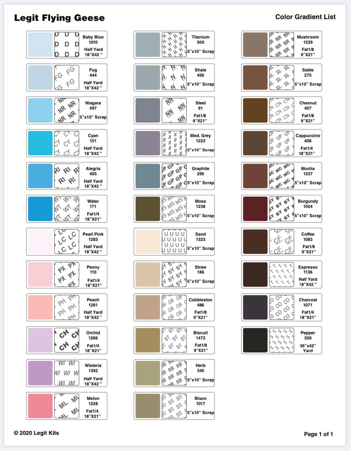 Show everyone what a REAL "flying geese" quilt looks like. Legit Flying Geese is a perfect medium sized Legit Kits product. This dramatic quilt top kit will finish at 37.5 inches wide x 50 inches long. Our fully printed pack contains color maps, fabric lists, an assembly guide, and the full pattern.